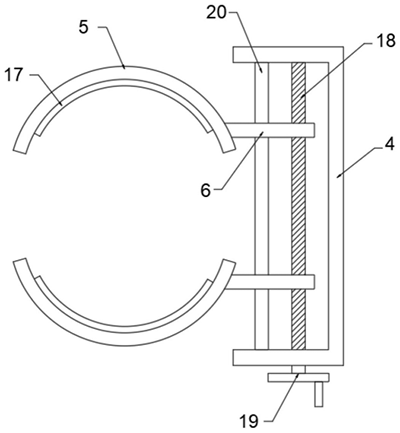 其中,U型架3内侧壁固定连接有呈U型设置的安装架4,固定圆盘2上方设有用于夹持钢桶的两个弧形夹板5,两个弧形夹板5相对一侧内壁均固定连接有第二橡胶垫17,利用第二橡胶垫17可防止弧形夹板5在钢桶外壁上造成划痕,弧形夹板5靠近安装架4的一端固定连接有活动板6,安装架4侧壁连接有用于调整两个活动板6前后位置的调节机构;调节机构包括转动连接在安装架4内侧壁的螺纹杆18,两个活动板6均螺纹套接在螺纹杆18外表面,螺纹杆18其中一端贯穿安装架4并固定连接有转轮19,安装架4内侧壁固定连接有限位杆20,两个活动板6均滑动套接在限位杆20上,利用限位杆20可对活动板6的移动进行限位,防止活动板6转动。