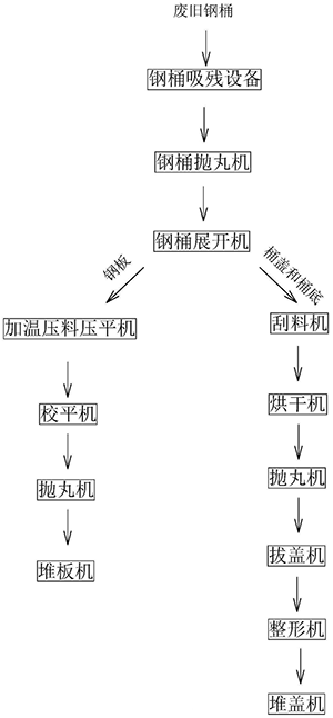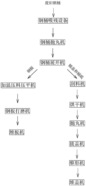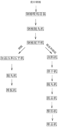 本申请实施例一种废旧钢桶再生加工工艺的实施原理为:废旧钢桶经过吸残设备吸收残留物料、钢桶抛丸机对外侧壁的抛丸处理、钢桶展开机对桶身的展平和对桶盖的分离、加温压料压平机对钢板的烘干压料处理、钢板抛丸机对钢板两侧壁的抛丸处理、堆板机对再生板的堆板存放、刮料机对桶盖和桶底的刮料处理、烘干机对桶盖和桶底的烘干处理、桶盖抛丸机对桶盖和桶底的抛丸处理、拔盖机对桶盖和桶底与残留桶身及桶沿的分离、整形机对桶盖和桶底的整形复原、堆盖机对再生盖的堆盖存放后,回收得到再生板和再生盖,对废旧钢桶进行了有效回收,且得到的再生板和再生盖可再次加工成钢桶使用,使用方便,同时,本实施例的废旧钢桶再生加工工艺全过程无污水排放,无喷漆等工序,是环境友好型再生工艺。