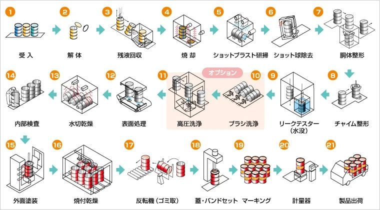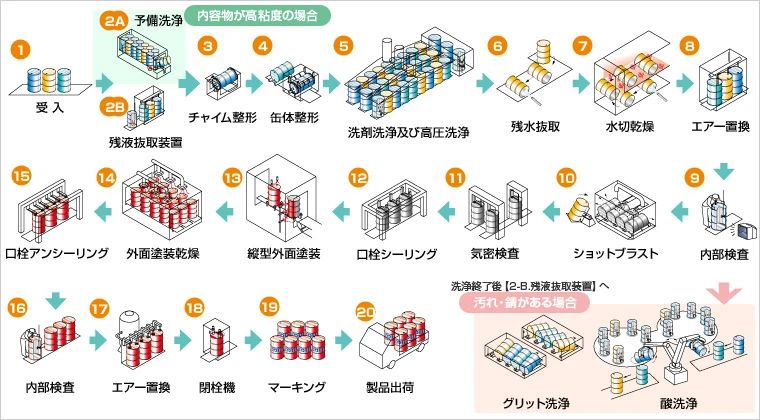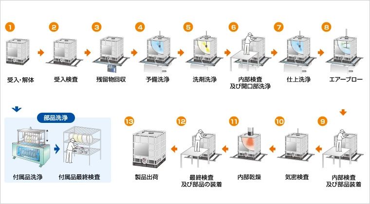 创业以来,通过钢桶再利用事业积累的清洗技术和自立系统,IBC中型容器也实现了高水平的翻新技术品质。