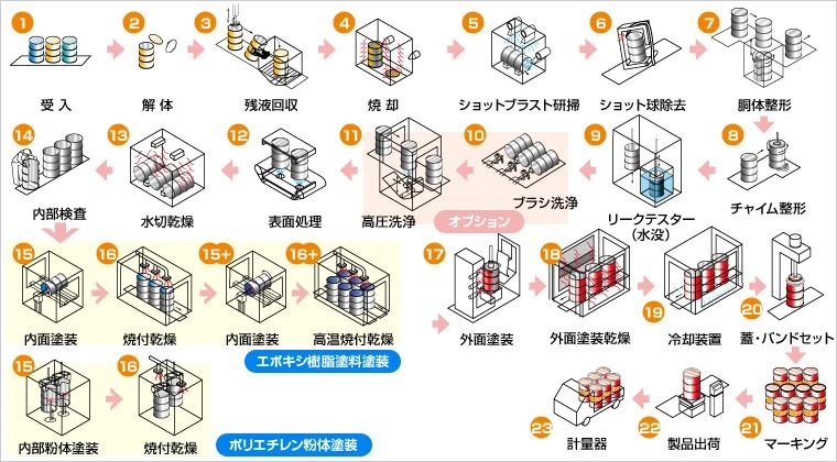 漫画典型旧钢桶及IBC桶翻新再用工艺流程