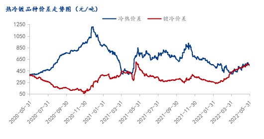 5月冷热价差窄幅扩大,截至5月末冷热价差为551元/吨,月环比扩大53元/吨;镀冷价差为541元/吨,月环比扩大47元/吨。从近期市场的情况看,热轧价格相对坚挺,冷轧价格偏弱,预计6月冷热价差或继续在500元/吨附近波动、镀冷价差继续窄幅运行。