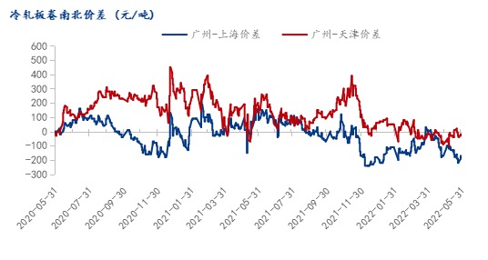 从5月整体市场看,南北价差区间震荡。截至5月底,广州与上海价差为-170元/吨,广州与天津价差为-30元/吨.从价差看,南下资源不具备价格优势。