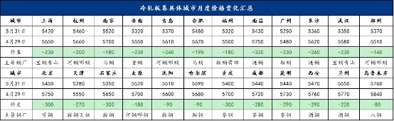 截至5月41日,现全国24个主要城市1.0mm冷轧板卷均价为5434元/吨,5月份累计下跌224元/吨;分城市来看,上海1.0mm宝钢青山卷价为5420元/吨,5月份累计下跌230元/吨,天津1.0mm鞍钢天铁卷价为5280元/吨,5月份累计下跌270元/吨,广州1.0mm鞍钢卷价为5250元/吨,5月份累积下跌230元/吨。5月份主要城市均呈现价格大幅下跌。