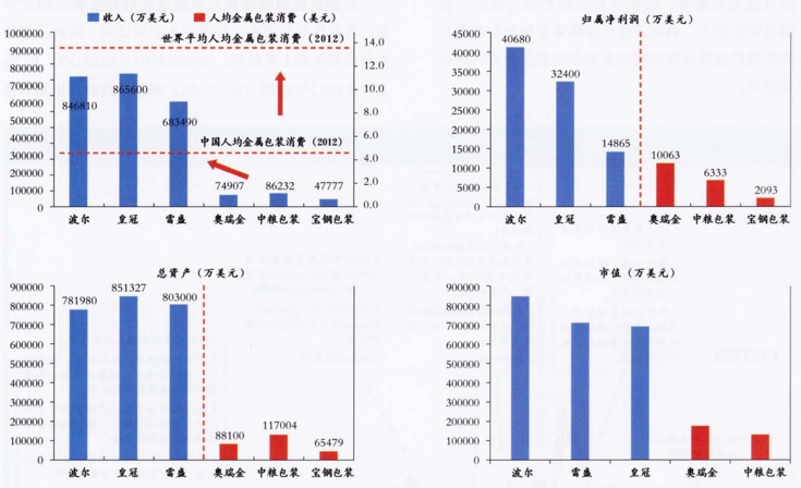 图3 2013年国内金属包装龙头与国际巨头收入、总资产、净资产对比