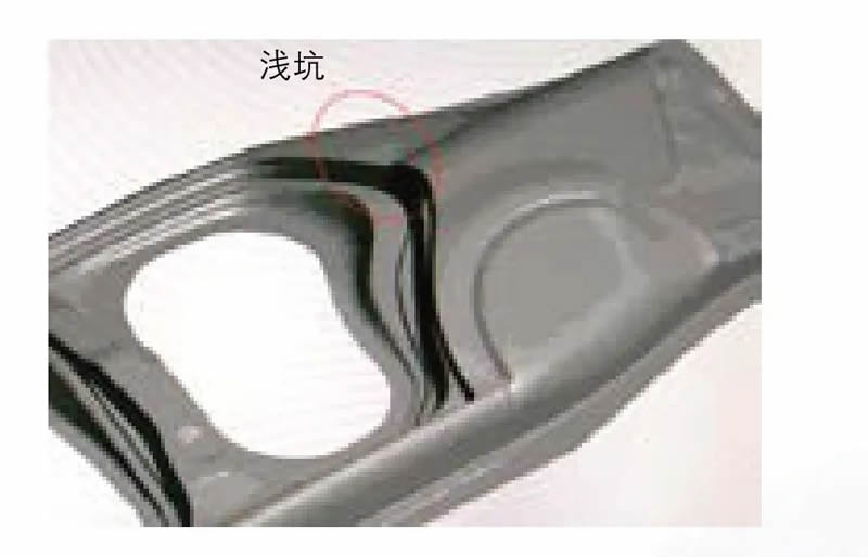 该车型侧围外板模具在前期调试时,由于C 柱腰线位置的暗坑缺陷,单件Audit 评审时扣B 类项,此问题为必须消除项,缺陷状态如图3 所示。