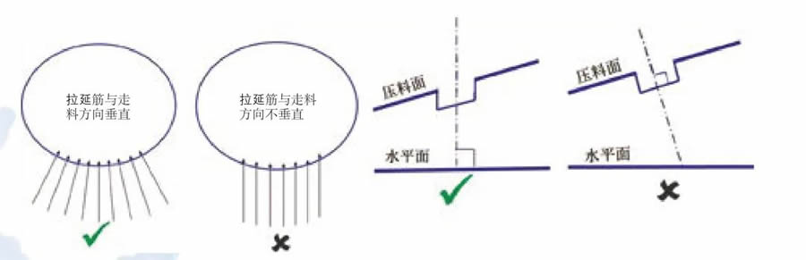 ⑻拉延筋设置时一定要保证与板料流动方向垂直,并且必须垂直于水平面,不能垂直于压料面,如图7 所示。