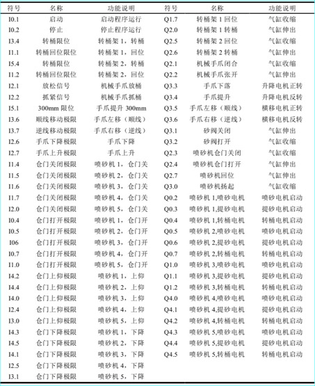 通过对工序流程的分析,喷砂机模块的控制需要7个信号采集点、4个控制按钮作为PLC的输入点,区别前面章节的I/O点分配,对控制喷砂机的输入输出点重新分配,如表4-4所示: