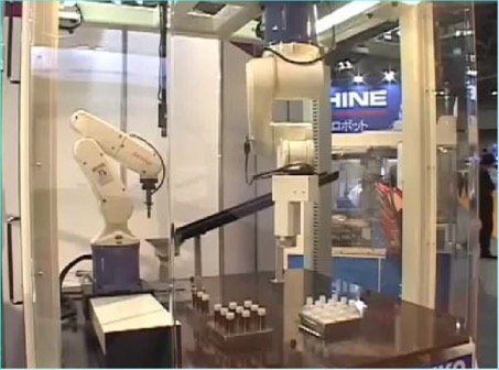 国外对于螺纹盖的封装技术研究起步较早,在一些大型的包装产品如矿泉水、啤酒、药品类等灌装生产线中,已经实现了理盖、送盖、旋盖等基本工序的一体化生产。旋盖机是用于螺纹盖装配的主要设备,根据相关资料显示,全球目前三分之一的旋盖机相关设备来源于德国,其销量位于全球第一,其次是美国、日本等发达国家。德国SEN公司提出的X35型真空旋盖机通过真空罩结构可以实现玻璃瓶的配盖、夹紧、旋盖等动作,其生产效率达到每分钟500瓶。Krones公司提出的WFG型自动旋盖机用于聚酯瓶灌装生产线,具有良好的稳定性,且装配合格率高,生产效率达到每小时40000瓶。随着机器人技术的逐渐成熟,采用工业机器人进行螺纹盖的装配已经成为了一种发展趋势,美国、日本等一些发达国家已经实现利用工业机器人进行螺纹装配。如图1-4所示,分别为采用六自由度工业机器人和Scara机器人进行螺纹盖装配的应用实例。