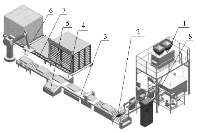 1.自动称量机 2.倒袋机 3.输送机 4.质量复检机 5.剔除机 6.码垛机器人 7.托盘输送机 8.控制柜