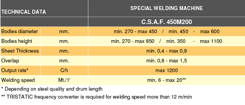 The fully automatic drum welding machine type C.S.A.F.450M200 for the longitudinal welding of steel drums and other metalcontainers of medium and large size is the ultimate result of the latest designtrends in this field. Operation flexibility has been the keyword from the verybeginning of this challenging Project. The C.S.A.F. 450M200 is suitable for production ofsteel drums and pails, when fast and trouble free changeovers are a must in theproduction time schedule.