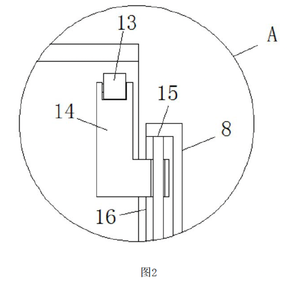 作为本实用新型的一种技术优化方案,转杆8设有滑槽16,两个滑块14滑动设置在滑槽16的两端,滑槽16内转动设有两端螺纹方向相反的螺杆15,螺杆15的两端分别和两个滑块14螺纹连接,在使用的时候,手动转动螺杆15带动两个滑块14相互靠近或者远离。