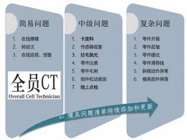 模具在线停机原因较多,针对发生频率和复杂程度,本文对模具在线停机问题分为简易问题、中级问题和复杂问题三类,并安排了针对性的处理团队:简易问题由冲压工处理,最大限度减少沟通传递造成的停机浪费;中级问题由模修工上线处理;复杂问题由模修班长和工程师处理,问题分级见图2。