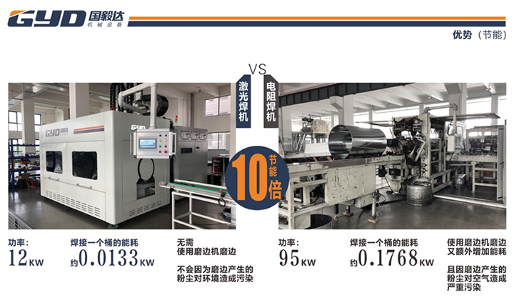 以传统全自动电阻焊机(8只/分)为例,焊接功率约为120KW。焊接功率约为0.25KVA/每只桶。焊接能耗为传统的十分之一。且省去磨边工艺(功率约为35KVA)。焊接完成后表面有修正轮纹路,如需平整则需要焊缝压平以及剪铁舌工艺(功耗约为30KVA)。