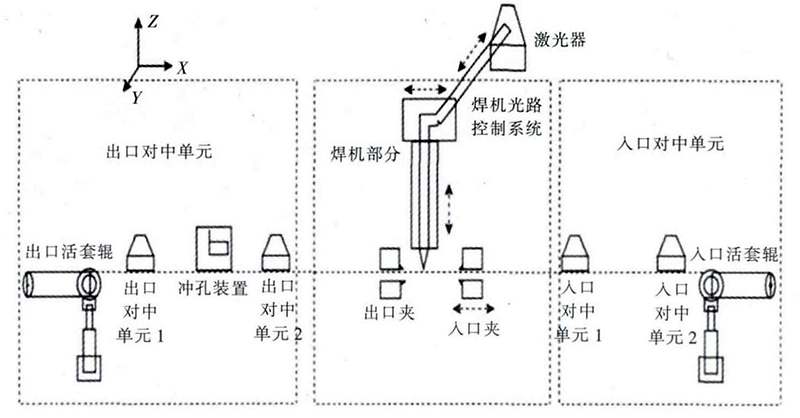 以德国克莱西姆LW22型激光焊机为载体, 重新设计以西门子PLC为核心控制器的整个控制系统。激光焊机机构运动比较复杂, 主要运动机构有活动梁光路装置和夹紧装置, 焊接过程中工艺流程主要有焊接准备、带头准备、带尾准备、带钢调整、焊机光路系统启动、完成焊接等。薄板金属焊接生产线如图1所示。