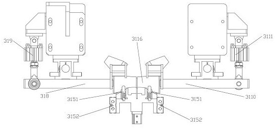 31、定位机构,311、左底座,312、右底座,313、抱紧机构,3131、第一圆弧形抱件,3132、第一抱件驱动件,3133、第二圆弧形抱件,3134、第二抱件驱动件,314、第一高度对齐机构,3141、挡板,3142、挡板驱动件,315、第二高度对齐机构,3151、弹簧定位销,3152、弹簧定位销驱动件,316、平整面,317、槽口,318、第一压板单元,319、第一压板驱动件单元,3110、第二压板单元,3111、第二压板驱动件单元,3112、铜块,3113、定位挡片单元,3114、定位挡片驱动件单元,3115、第二支撑辊轮,3116、下压轮;