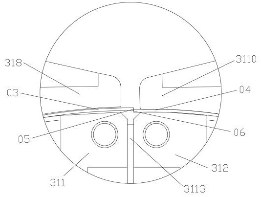 如图16所示,底座设有容纳腔且底座上端面沿卷料的轴线方向开设有槽口317,槽口317与容纳腔相连通;本实施例中,底座固定设置在第一待焊接端03和第二待焊接端04正下方且底座包括左底座311、右底座312,左底座311、右底座312为左右对称设置;左底座311的顶面与右底座312的顶面相邻部分均为一平整面316,左底座311的顶面与右底座312的顶面除去平整面316均为弧面;槽口317设置在两个平整面316的交界处,槽口317沿其长度方向的中部以及槽口317其一端的端部连通有吹气装置;现有技术中,一般吹气装置连通在槽口317的两个端部,然后吹气装置从槽口317的两个端部同时往中间吹氮气进行焊渣的吹扫,两股对流的氮气会导致焊渣残留在槽口317内部,无法吹扫干净;本实施例中吹气装置连通在槽口317沿其长度方向的中部以及槽口317其一端的端部,两股氮气朝槽口317其中未设置吹气装置的一端吹出,试验证明该设置将焊渣吹扫的很干净,同时,吹气装置吹氮气还可以防止焊接时的氧化,保证了焊缝的清洁,如果焊缝在焊接时被氧化,在后期对焊缝进行补膜时,会影响膜的附着力,进而影响产品质量。