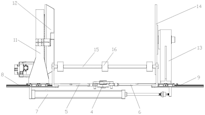 所述第一夹持部包括第一固定座11、设置在第一固定座11上的第二驱动件、与第二驱动件通过齿轮传动连接的套模12(如图5所示),本实施例中,第二驱动件为伺服电机;所述桶身的一端可插卡固定在套模12上;所述第一固定座11固定在第一直线导轨8的滑块上;所述第二夹持部包括第二固定座13、通过轴承转动装配在第二固定座13上的转盘14;所述第二固定座13固定在第二直线导轨9的滑块上;所述支撑部包括一对平行于X轴的第二支撑杆15、转动装配在每根第二支撑杆15上的第二滚轮16。所述第一气缸7固定在第一固定座11和第二固定座13上。