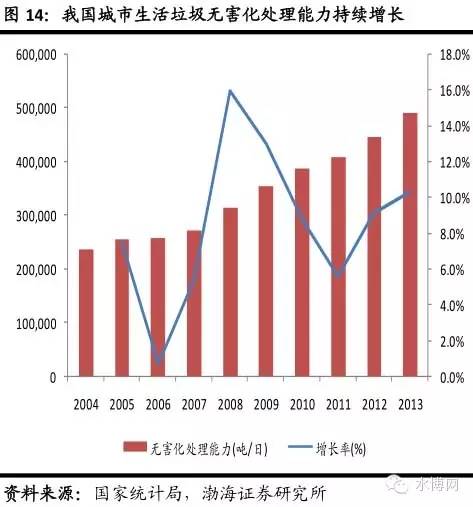 就 垃圾焚烧发电而言,随着技术成熟度和核心设备国产化水平的不断提高、应用成本下降,凭借资源化、无害化、减量化等突出优势,我国垃圾焚烧发电发展十分迅 速。2004-2013年,我国城市生活垃圾焚烧无害化处理能力增加了约8.4倍,年复合增长率达28.2%;在无害化处理方式中的比重则从7.1%跃升 到32.2%,成为垃圾无害化处理能力增量的主要贡献力量。另外,政策层面,垃圾焚烧发电受到国家政策大力扶持。