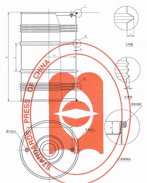 桶顶由桶顶、桶口盖、排气孔、充氮孔组成。排气孔和充氮孔各有螺栓、螺母、钢制圆垫圈、密封垫圈、密封衬圈组成见表A.1。
