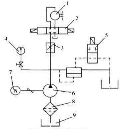 5-电磁溢流阀;6-齿轮油泵;7-电机;8-油过滤器;9-油箱