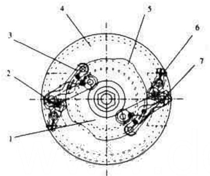 1-压盖头圆盘;2-二道封轮;3-牵手A;4-转盘;