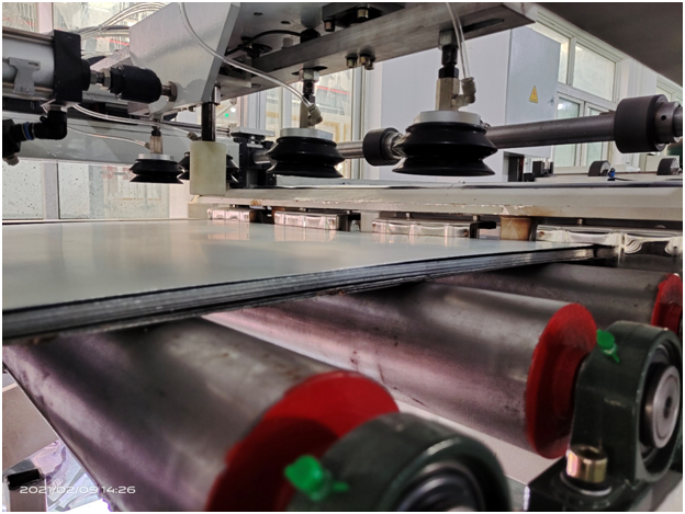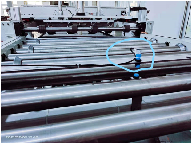 开卷校平后,剪切的标准桶身板材,整齐码垛到待上料架上(上料架可根据钢板数量,设定升降高度),再经真空吸盘,将板材逐一输送到纵剪修边以及卷圆机构。输送线即有钢板分张器,确保板材前端分离,又带有超声波单张检测装置,出现2张以上钢板,则自动报警停机。图中标注的是超声波单张检测装置。