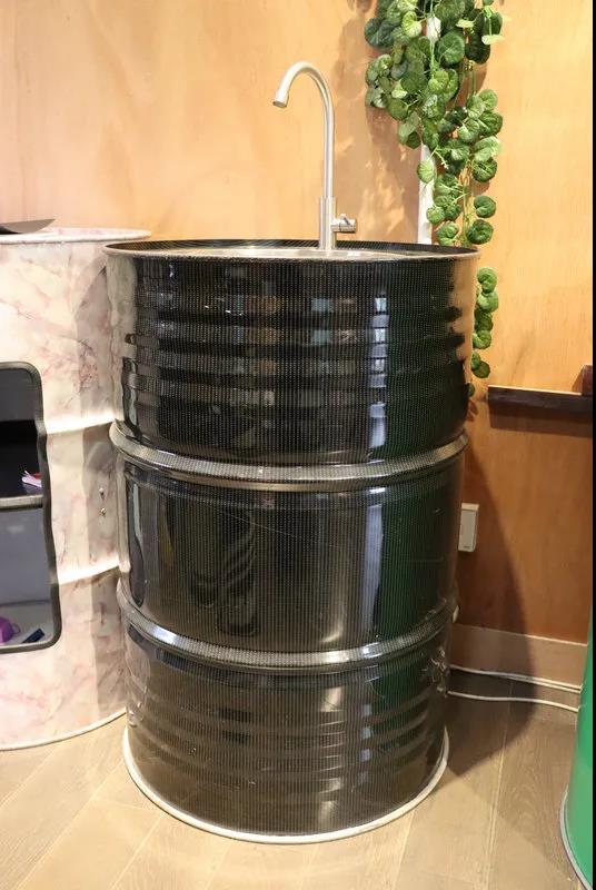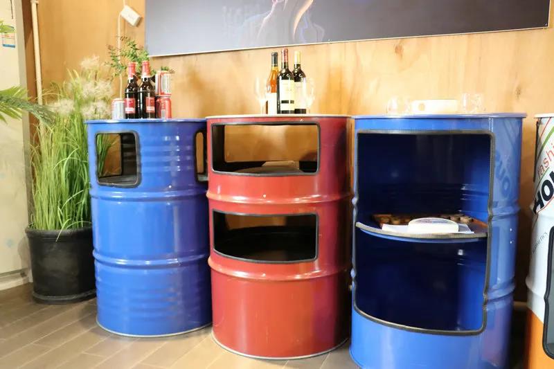 2015年,一个朋友问贝国平要一个钢桶,放在自己刚开业的咖吧里,用作装饰的柜子。受到启发的贝国平由此开辟了制桶路上的另一片天地——桶制家具。靠背椅、茶几、矮凳、高凳、柜子、洗手台、烧烤炉……这些充满工业风的家具,以其靓丽的外观和个性化的设计,很快受到了不少年轻人的青睐。某时尚品牌的实体店,甚至还专门定制这样的家具,在全国门店统一使用。