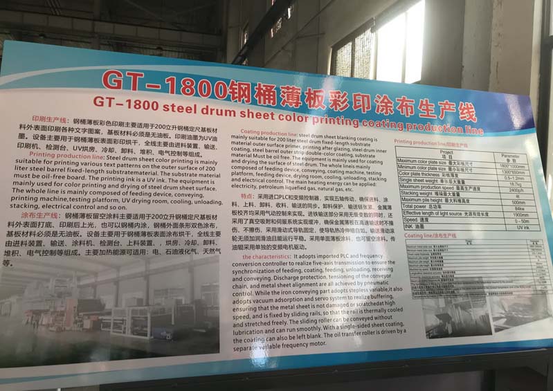 200L钢桶属于金属包装,目前传统的工艺仍然通过喷涂的方法,只能是单色、条形双色喷涂,成本高能耗大。GT-1800钢桶薄板彩印涂布生产线投入生产后,真正实现不需要清洗磷化、不需要喷漆、不需要印字、不浪费油漆和涂料,是先印刷涂布后制桶、内涂料外印刷的新工艺新方法,完全颠覆了目前钢桶行业传统的制桶工艺。“GT-1800钢桶薄板彩印涂布生产线普及以后,钢板卷完一封就可以交货了,外观既美观又漂亮,而且生产车间又没有污染,实现了洁净生产,是一件利国利民的好事。”中国包装联合会钢桶专业委员会专家组组长辛巧娟表示。