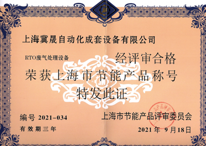 历时一年,由上海市环境保护产业协会推荐,上海冀晟自动化成套设备有限公司制造的“RTO废气处理设备”,荣获了“上海市节能产品”称号。