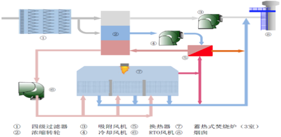 脱附后的废气浓度可提高3-30倍,废气风量为原风量的1/3-1/30,大大降低了焚烧系统的负荷。废气风量变小,浓度升高,降低焚烧时候的燃料消耗,节约能源,同时焚烧的高温气体可进行热能回收利用。
