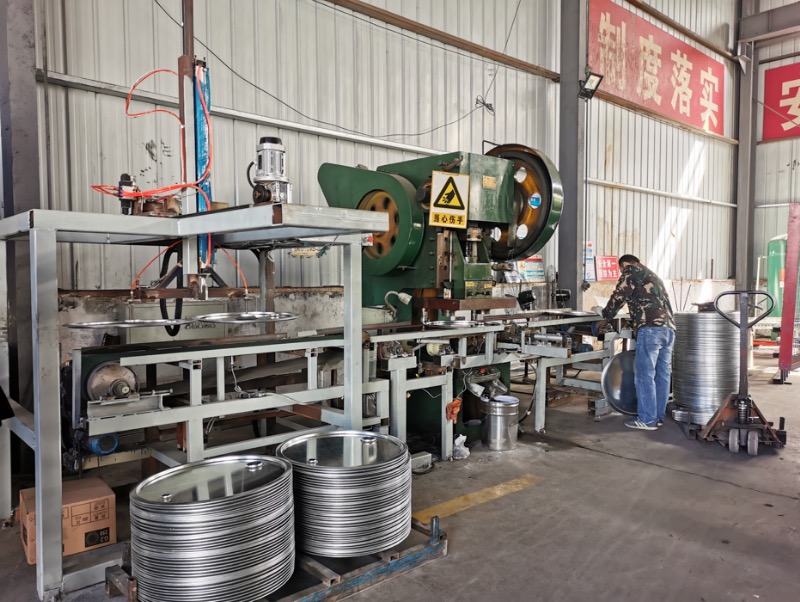 由于齐鲁包装每年自己还要生产50多万只钢桶,曲总在生产中为了降低生产成本,不断进行技术改造,主要设备从专业厂商购置,辅助设备自己研发,他带领自己的研发团队,先后研究了桶身磨边机,桶身洗板机、擦桶机、桶身涂布机、碾平机、桶盖码垛装置、自动冲孔装置等。今天我们先看视频中刚改造好试运行的桶顶冲孔堆垛自动装置及自动磨边机,由于我到工厂时,正赶上下班时间,所以桶盖是人工放置的。