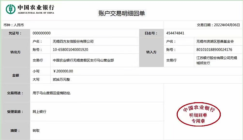 4月6日,四方友信再捐赠20万元用于支持无锡马山度假区抗疫!