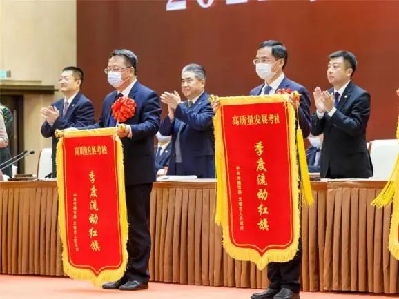 在激昂的旋律中,2021年度综合考核获奖代表、无锡高质量发展年度贡献奖获奖代表、2022年一季度“担使命作贡献”季季评获奖代表,分批走上前台,郑重地从市领导手中接过沉甸甸的奖牌和鲜红的锦旗。