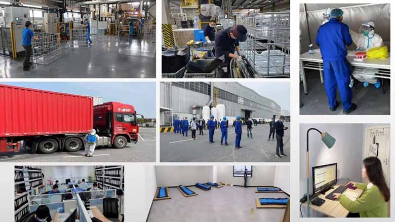 (1/2.井然有序的生产现场,3.物流车辆消杀,4/7.排队核酸,5.供应链团队为采购进出口和物流保驾护航 ,6.临时宿舍, 8. 居家办公接单忙)