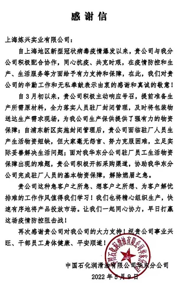 【编者按】5月9日,上海炼兴实业有限公司收到了中国石化润滑油有限公司华东公司送来的《感谢信》,对上海炼兴实业有限公司在本次上海疫情爆发后,采取的积极应对,进行了肯定。在上海疫情十分严重的3~4月份,上海炼兴实业有限公司能够做到生产抗疫两不误,实在是非常难得的。这里,我们将这封感谢信分享给大家,这是全国制桶企业学习的榜样!