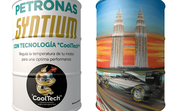 这也是为什么Petronas(马来西亚国家石油公司,简称“马石油”)找到格瑞夫帮助他们再次将其品牌及其新型优质润滑油Syntium Cooltech投放到阿根廷市场时,格瑞夫能够远超预期,将Petronas双子星大楼和F1赛事的图片印刷在钢桶钢桶桶身(钢桶)上,面向消费者进行宣传。