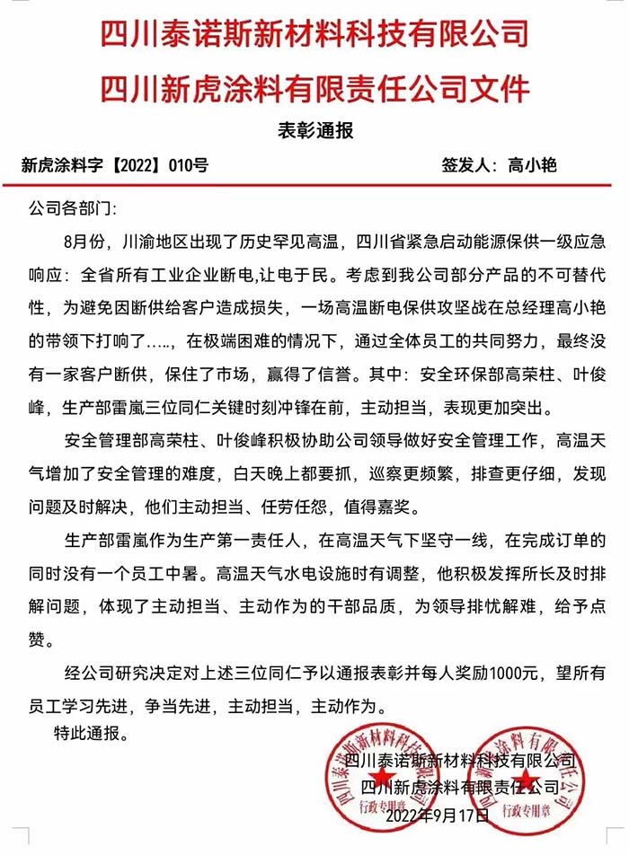 8月份,川渝地区出现了历史罕见高温,四川省紧急启动能源保供一级应急响应:全省所有工业企业断电,让电于民。考虑到我公司部分产品的不可替代性,为避免因断供给客户造成损失,一场高温断电保供攻坚战在总经理高小艳的带领下打响了……,在极端困难的情况下,通过全体员工的共同努力,最终没有一家客户断供,保住了市场,赢得了信誉。其中:安全环保部高荣柱、叶俊峰,生产部雷胤三位同仁关键时刻冲锋在前,主动担当,表现更加突出。