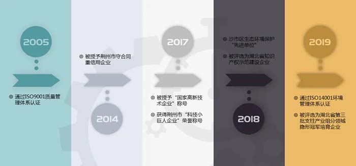 公司系国家高新技术企业、中国包联专业委员会理事单位,获得ISO9001质量管理体系认证证书、ISO14001环境管理体系认证证书、全国工业产品生产许可证、出口危险品包装代码证。公司先后被授予湖北省知识产权建设示范企业、湖北省隐形冠军企业、湖北省两化融合示范企业、荆州市守合同重信用企业、荆州市模范劳动关系和谐企业、荆州市科技小巨人企业、沙市区生态环境保护先进单位、安全生产三级企业等称号。