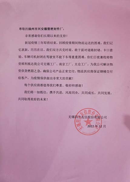 非常感谢你们长期以来的支持!新冠疫情三年即将结束,回顾疫情期间物流运送的困难,我们记忆犹新,历历在目。我们双方共克时艰、敢于面对道路封堵、卡口查验、车辆司机封闭在驾驶室不能下车等重重困难,你们日夜兼程将物资顺利抵达我公司无锡工厂、南京工厂、太仓工厂,为我公司解决物资供货燃眉之急,确保公司产品正常交付,物流供应商保证钢桶交付给客户,为疫情保供做出非常大的贡献!每个供应商都值得我们尊重、敬仰和感谢!我们将一如既往,携手共进,风雨同舟,共同发展,共同取得美好的未来!