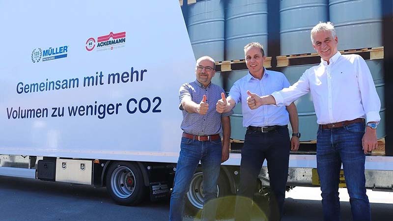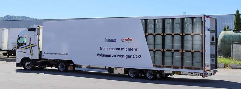 Ackermann Fahrzeugbau AG公司为Müller AG Verpackungen公司开发了一款特殊的拖车,由于额外的体积,该拖车可以多运输30%的钢桶。效率是值得的,因为它减少了运输次数,减少了二氧化碳排放。