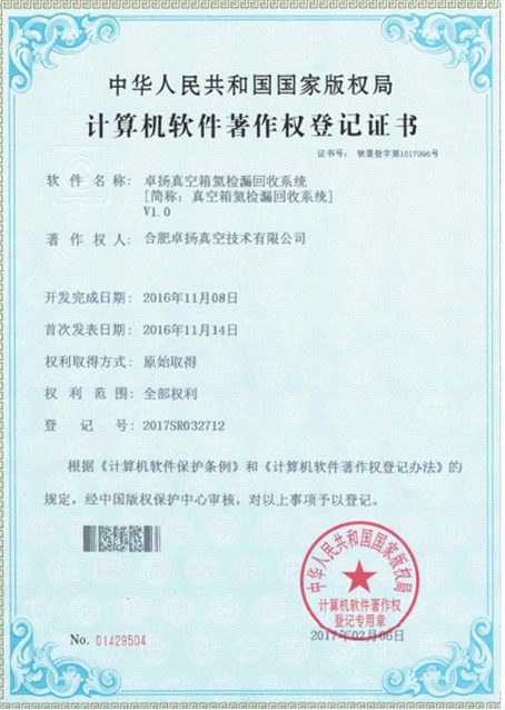 下面是该公司拥有的真空箱抋检漏回收系统的软件著作权证书。