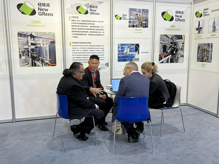 国际化、创新和可持续性发展是金属包装行业发展的趋势。纽格润一直致力于积极探索制桶设备和智能制造解决方案的发展和创新。立足中国,迈向世界,此次METPACK展会上,纽格润以“革新科技创造绿色未来”为主题,向海内外客户和观众呈现了基于中国行业实践的立式制桶设备、智能制造解决方案(机器人集成等)和绿色环保的覆膜铁(合作伙伴公司产品)等产品和服务。
