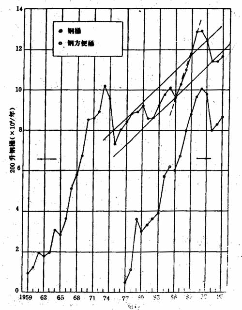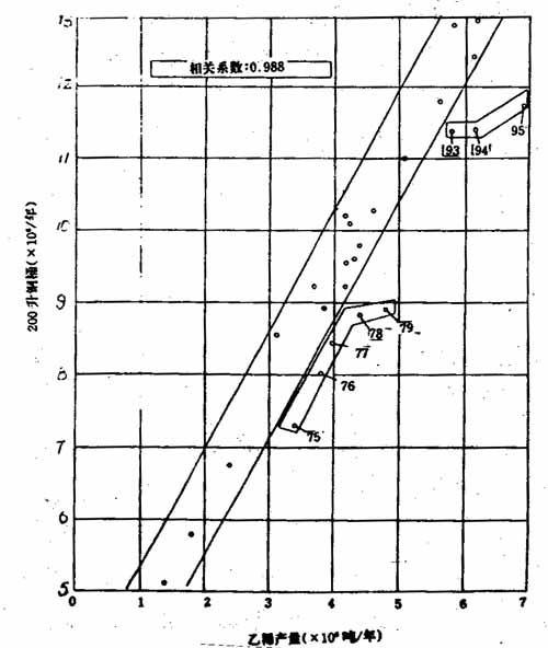 但是,显然这是一种值得研究的随伴关系。因为1994年乙烯的产量仅占日本化学工业总产值的9.2%。然而,在日本,由于乙烯生产是说明200升钢桶需求的一个有代表性的指数。所以,可以理解这两个生产之间存在一种非常密切的关系。(顺便说说:在1968年以前;日本的工业高速发展阶段,钢桶生产和粗钢生产有着密切的随伴关系)。