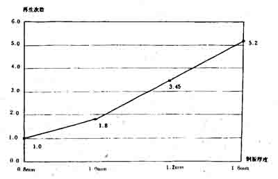 通过日本钢桶协会国际标准化的调查报告,1.0毫米壁厚的钢桶可再生约1.8次,而1.2毫米壁厚的钢桶平均可再生约3冬45次Q参见图1,厚度与可再生次数。