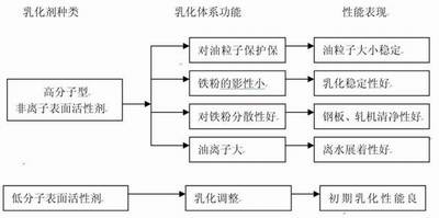 轧制油经加水乳化后用于轧制钢板,其润滑性能和冷却性能不是孤立的,而是以离水展着性能(plate-out)来表征。其现象是喷射到轧辊及带钢上乳化液开始为水包油型,当温度超过100℃时,随着水的汽化,轧制乳化液本身发生变化,使油铺展在钢板表面上。这时,轧制乳化液润滑门头沟能的好坏直接与相变后的成膜情况、分子层极性及油膜强度密切相关。因此,合适的离水展着性能是控制轧制油润滑性和冷却性的关键。