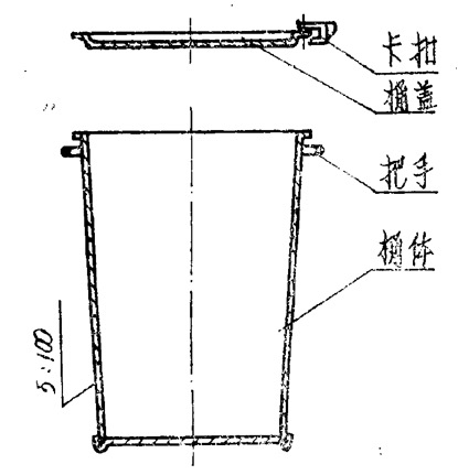 考虑到上述情况,笔者建议采用全敞口式的专用桶作为肉联厂炼油生产的包装容器,其形式见设计示意图。