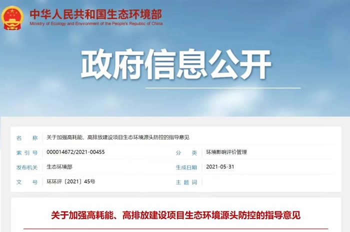 近日,生态环境部发文,为全面落实党的十九届五中全会关于加快推动绿色低碳发展的决策部署,坚决遏制高耗能、高排放(以下简称“两高”)项目盲目发展,推动绿色转型和高质量发展,现就加强“两高”项目生态环境源头防控提出如下指导意见。首先,加强生态环境分区,落实区域削减要求,合理划分事权。推进“两高”行业减污降碳协同控制,提升清洁生产和污染防治水平,将碳排放影响评价纳入环境影响评价体系。依排污许可证强化监管执法,加强排污许可证管理,强化以排污许可证为主要依据的执法监管。保障政策落地见效。