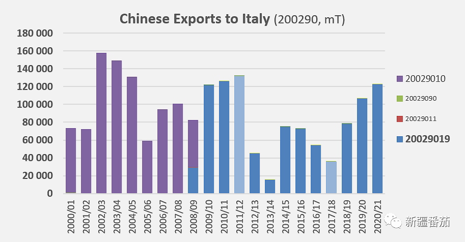 本出口年度,中国出口意大利大包装蕃茄酱12万吨。连续四年增加。