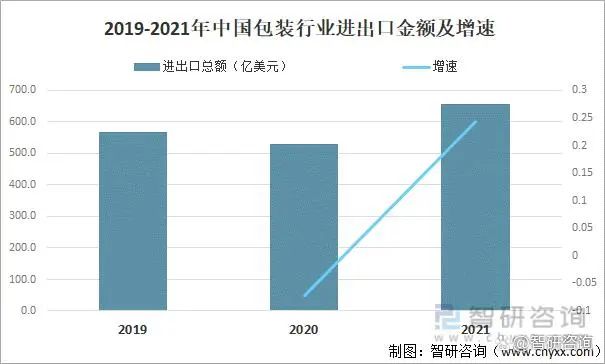 包装是指为在流通过程中保护产品,方便储运,促进销售,按一定的技术方法所用的容器、材料和辅助物等的总体名称。2021年中国包装行业完成累计进出口总额656.80亿美元,同比增长24.31%。