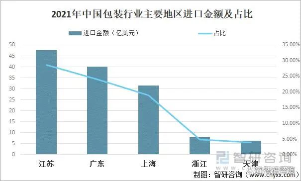 2021年1-12月,中国包装行业完成累计进口额166.04亿美元。按收发货人注册地进口额排在前五位的地区依次是江苏、广东、上海、浙江、天津。其中:江苏完成累计进口额47.53亿美元,占总进口金额的28.63%;广东完成累计进口额40.13亿美元,占总进口金额的24.17%;上海完成累计进口额31.53亿美元,占总进口金额的18.99%;浙江完成累计进口额7.95亿美元,占总进口金额的4.79%;天津完成累计进口额6.35亿美元,占总进口金额的3.82%。